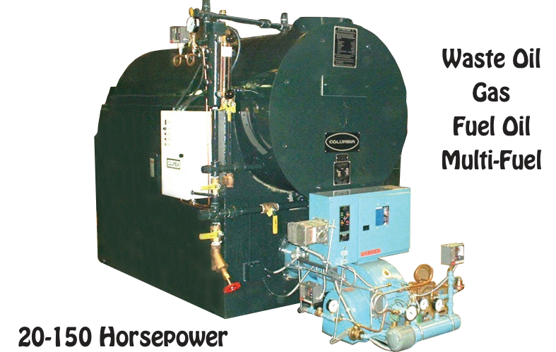 The Columbia HRT is a Rugged, horizontal boilers for industrial process steam applications. Two-pass firetube, 15 – 150 psi steam boiler, or 30 psi hot water boiler built to ASME Section I specifications. 800,000 – 6,300,000 BTU. May be powered with traditional fuels or waste oils.